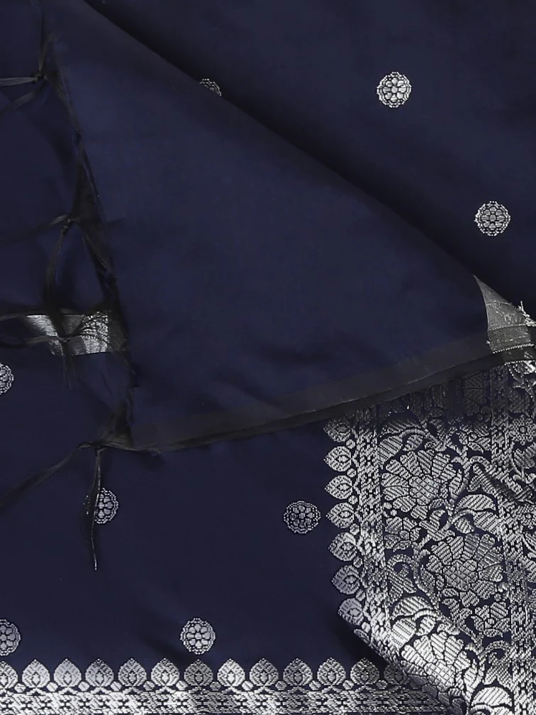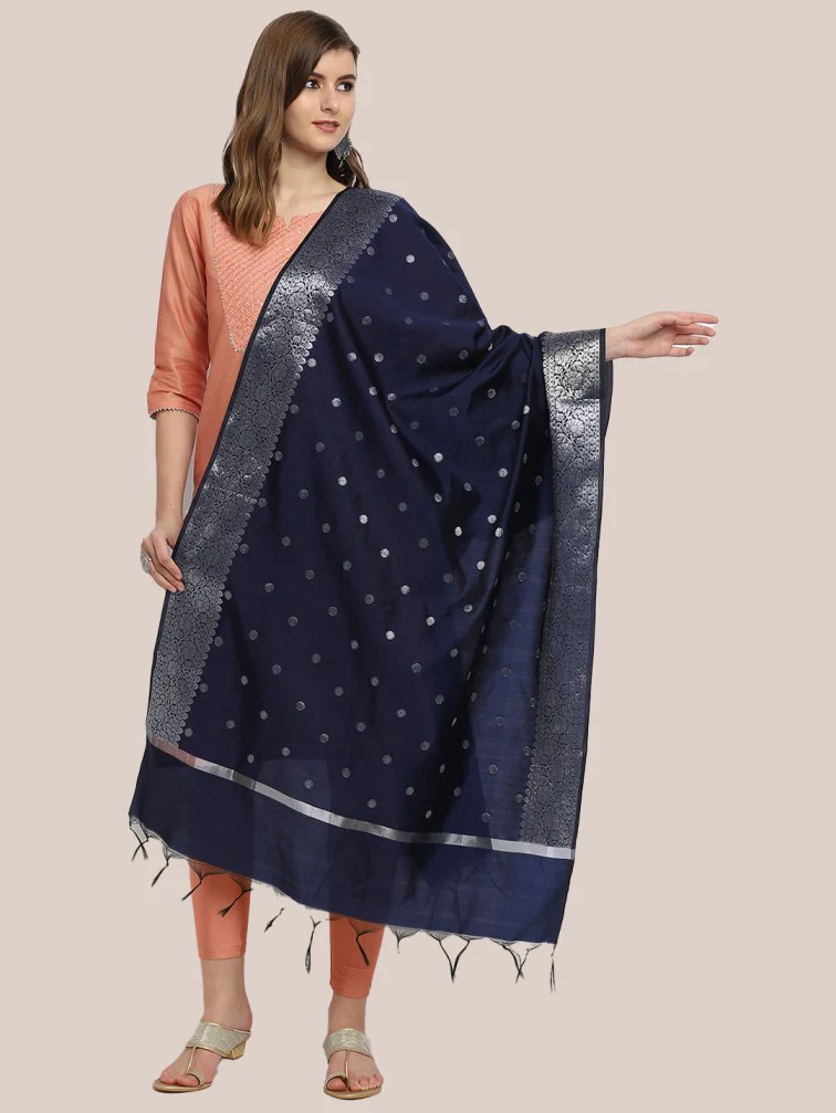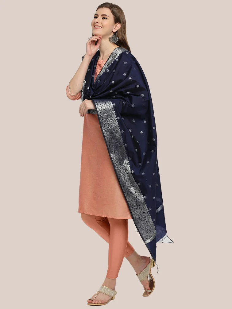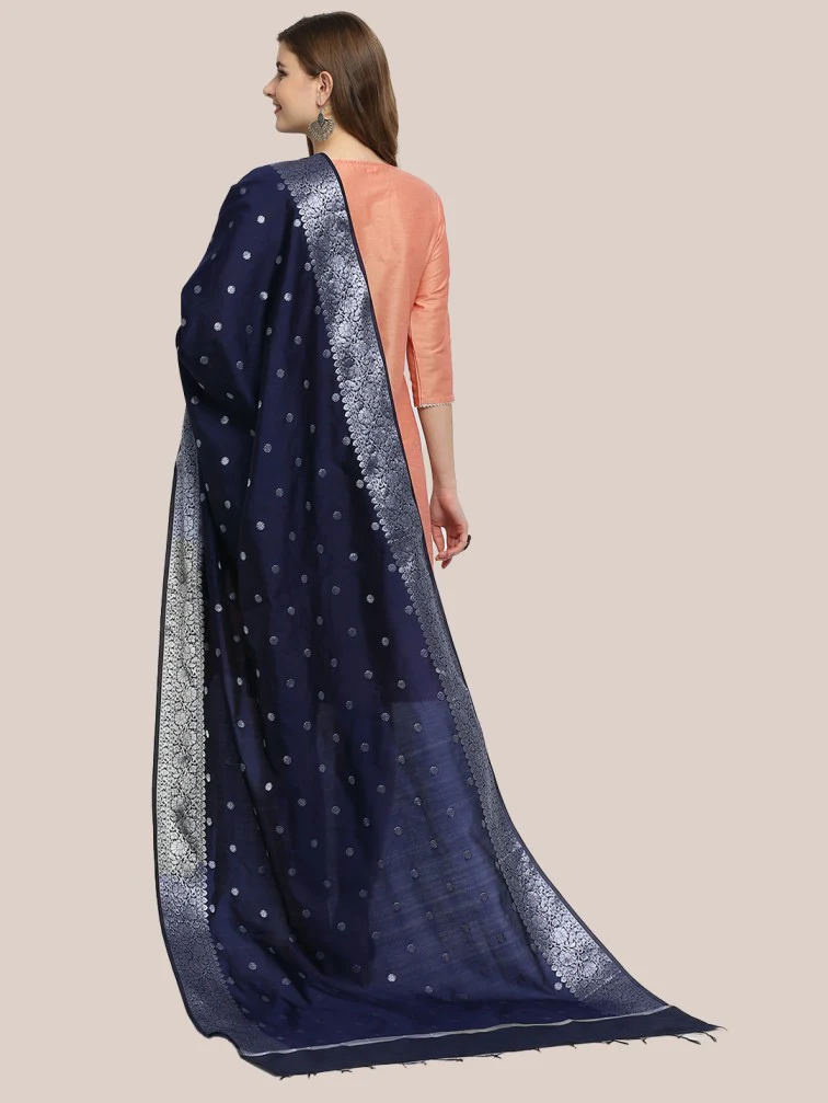 - This Fine Banarasi dupatta is adorned with beautiful woven motifs along with rich silver zari border.