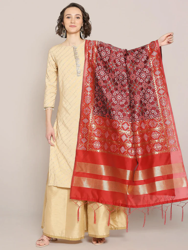 Add a touch of elegance to your wardrobe with this exquisite piece of beautiful Banarasi Silk Dupatta. Swathed with elegant Patola-style weaving all over, this classic stunner is a must in your ethnic collection.
