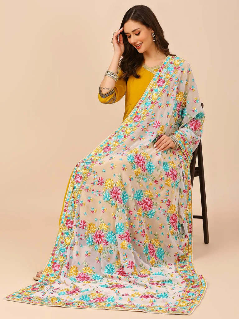 Swathe in the beauty of this heavily embroidered dupatta in gorgeous georgette fabric. So add this classic dupatta with all over floral embroidery in bright hues to enhance your lehenga, kurti, anarkali or saree. Rich & regal this elegantly embroidered dupatta would be a stunning and versatile addition to your wardrobe. Wrap around this astounding piece and grace your favourite occasion, festivals and weddings.