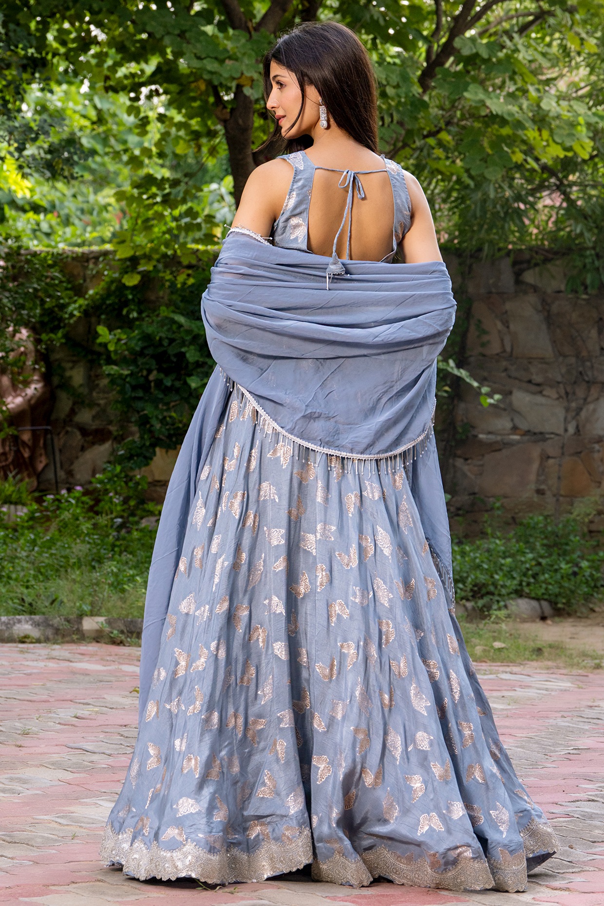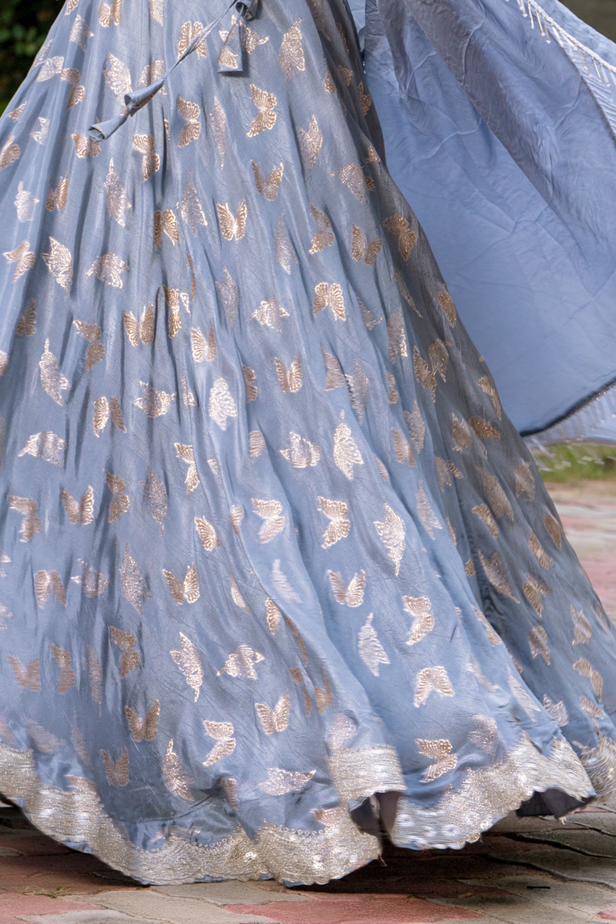 PRODUCT DESCRIPTION Featuring a grey lehenga in upada silk base butterfly detailing. It is paired with a blouse and an organza dupatta. Accentuate with chandbali earrings and heels for an engagement ceremony or a festive occasion.