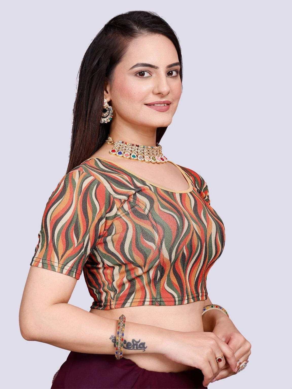Elevate your wardrobe with this chic blouse crafted from stretchable Lycra fabric. The round neck design offers a classic and flattering silhouette, while the half sleeves provide a touch of elegance and versatility. The Lycra material ensures a comfortable, form-fitting shape that moves withyou, making it perfect for both casual and formal occasions. Embrace style and comfort with this must-have addition to your collection.