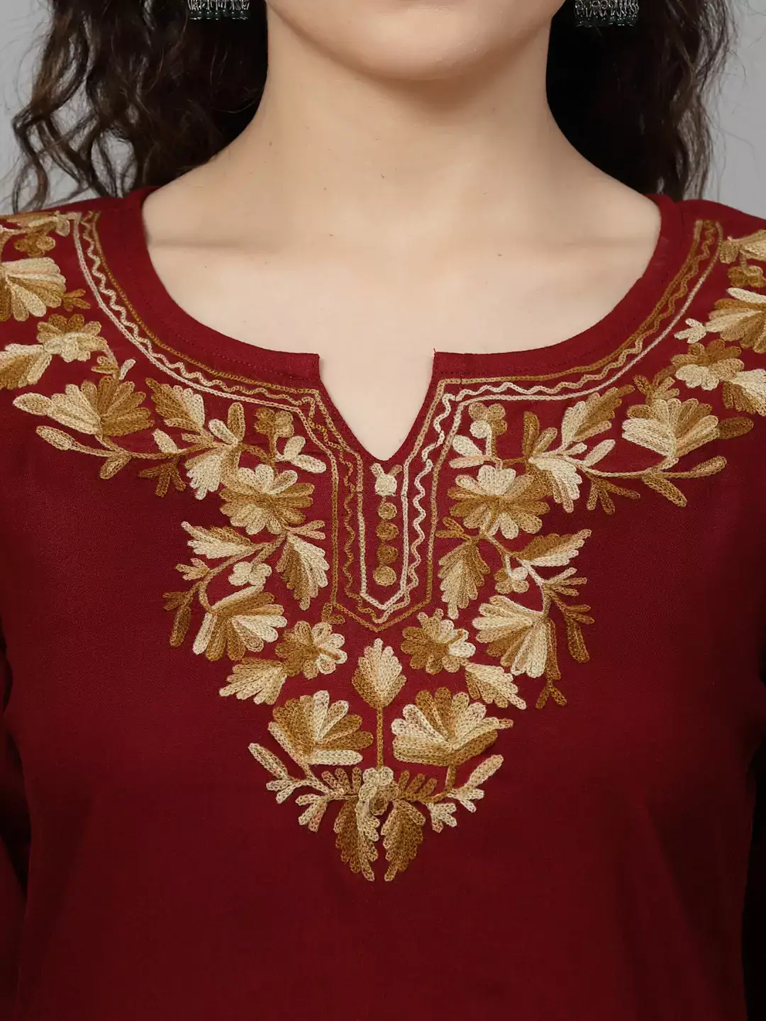 Color: Maroon Kurti Type: Short Shape: Straight Fabric: Rayon Cotton Length: 42 Inches Neck: Keyhole Neck Sleeves: Three-Quarter Sleeves Embroidery: Kashmiri Embroidery- 100% Authentic WashCare: Handwash Do not scrub the product and Dry in shade If it is a naturally dyed, Color might bleed slightly during the first few washes.