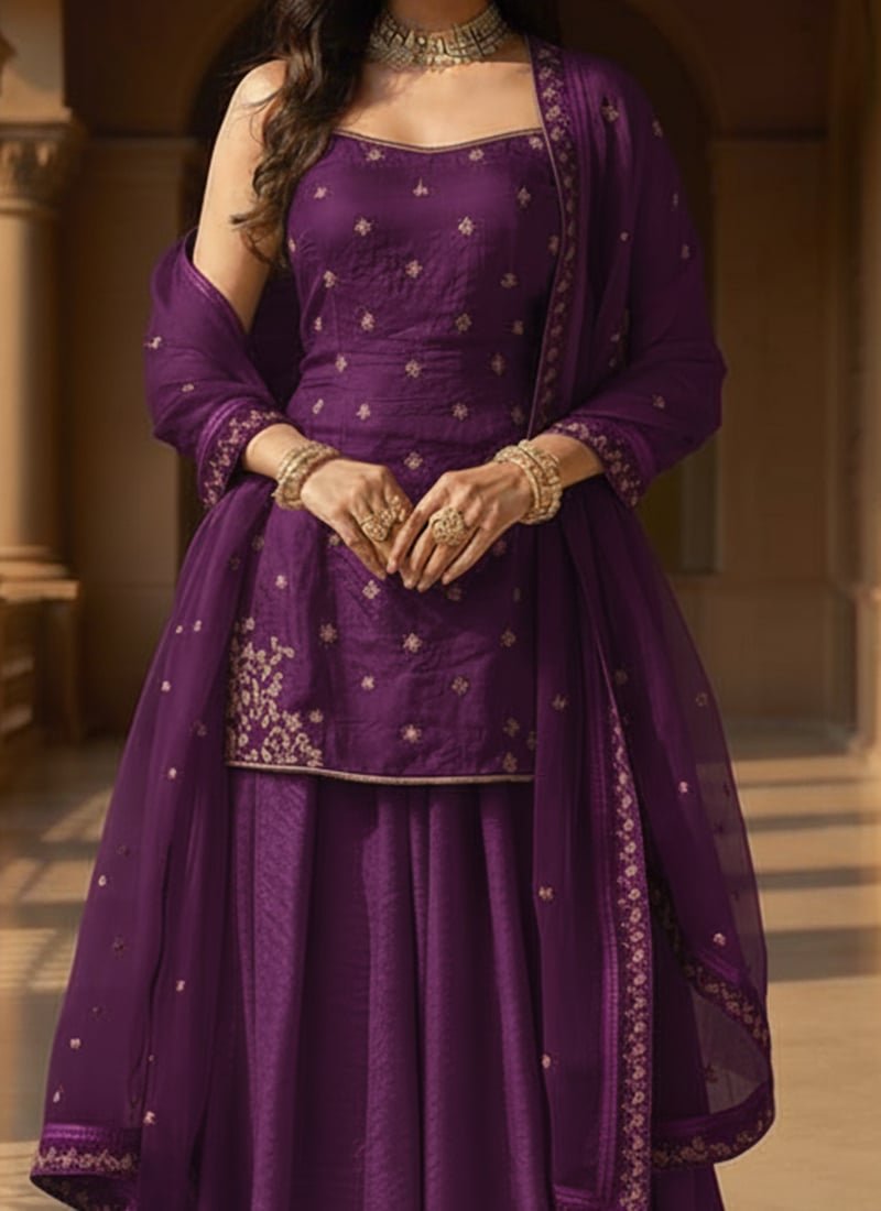 Purple Organza Sequins Moti Hand Embroidered Palazzo Suit Festive Wear