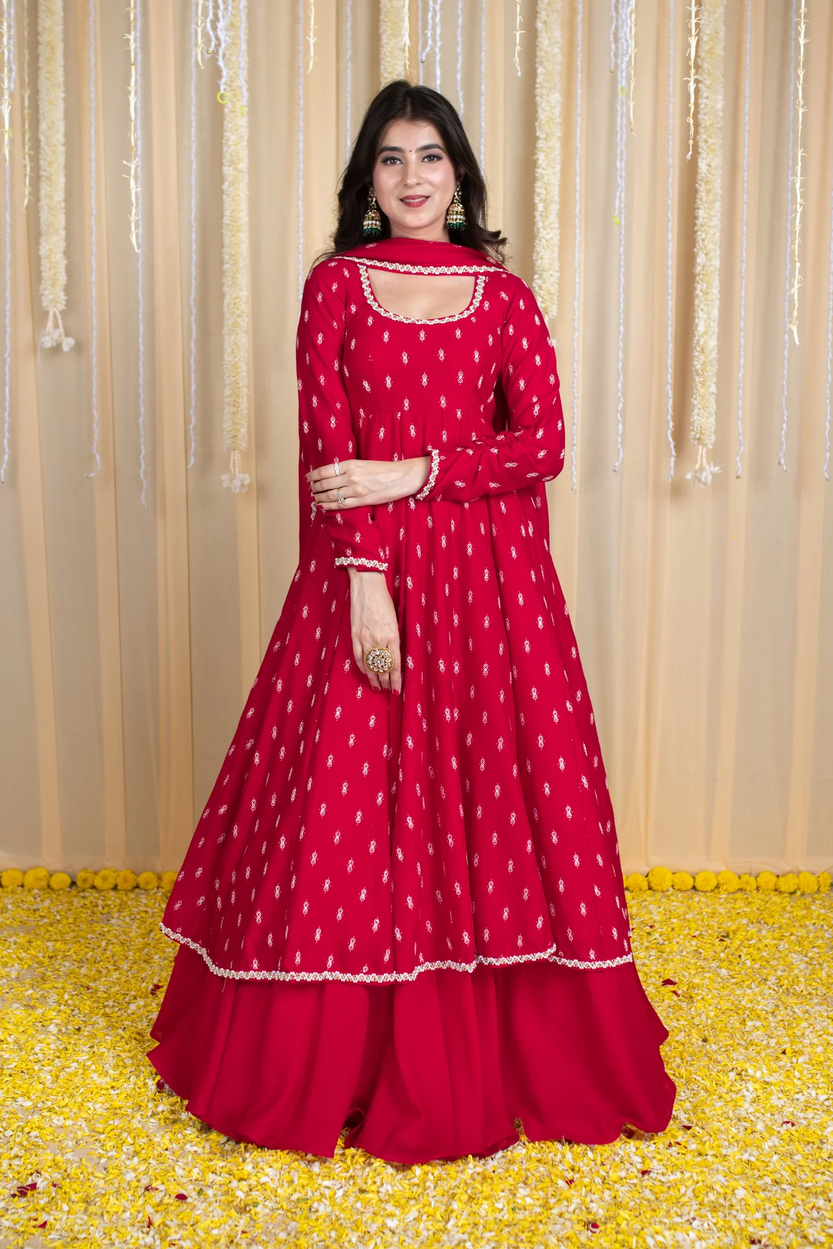 Red Anarkali Lehenga Set with Rubber Foil Detailing