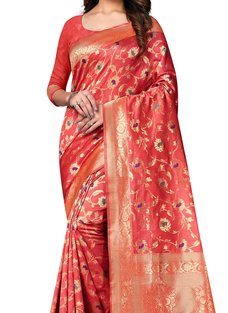 Red Banarasi Silk Zari Weaving Work Saree Festive Wear