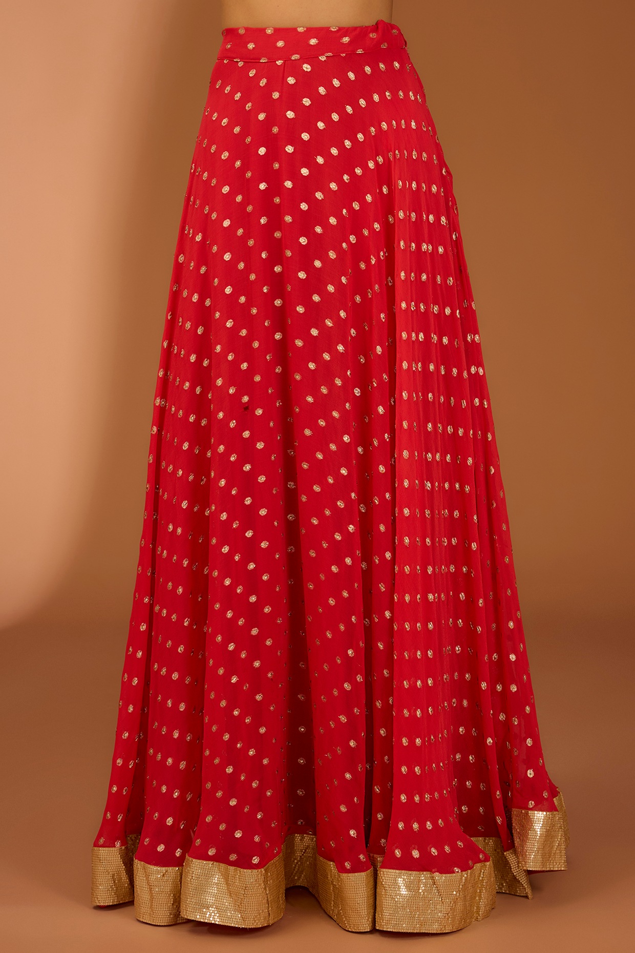Featuring a red lehenga in a georgette base with lace work. It is paired with a blouse having a V-neckline and a dupatta. Accentuate it with statement jewellery and heels for a wedding or sangeet ceremony.