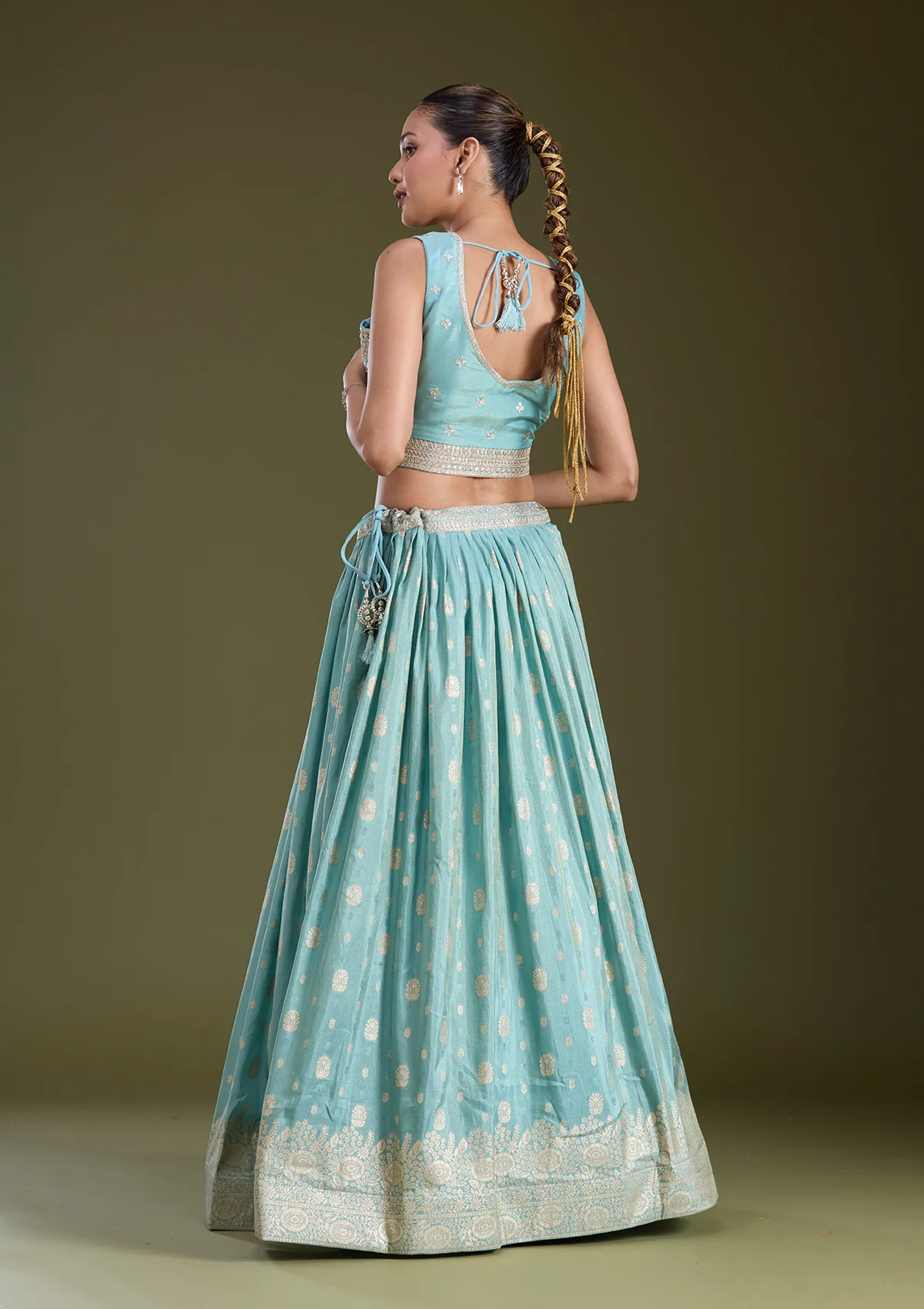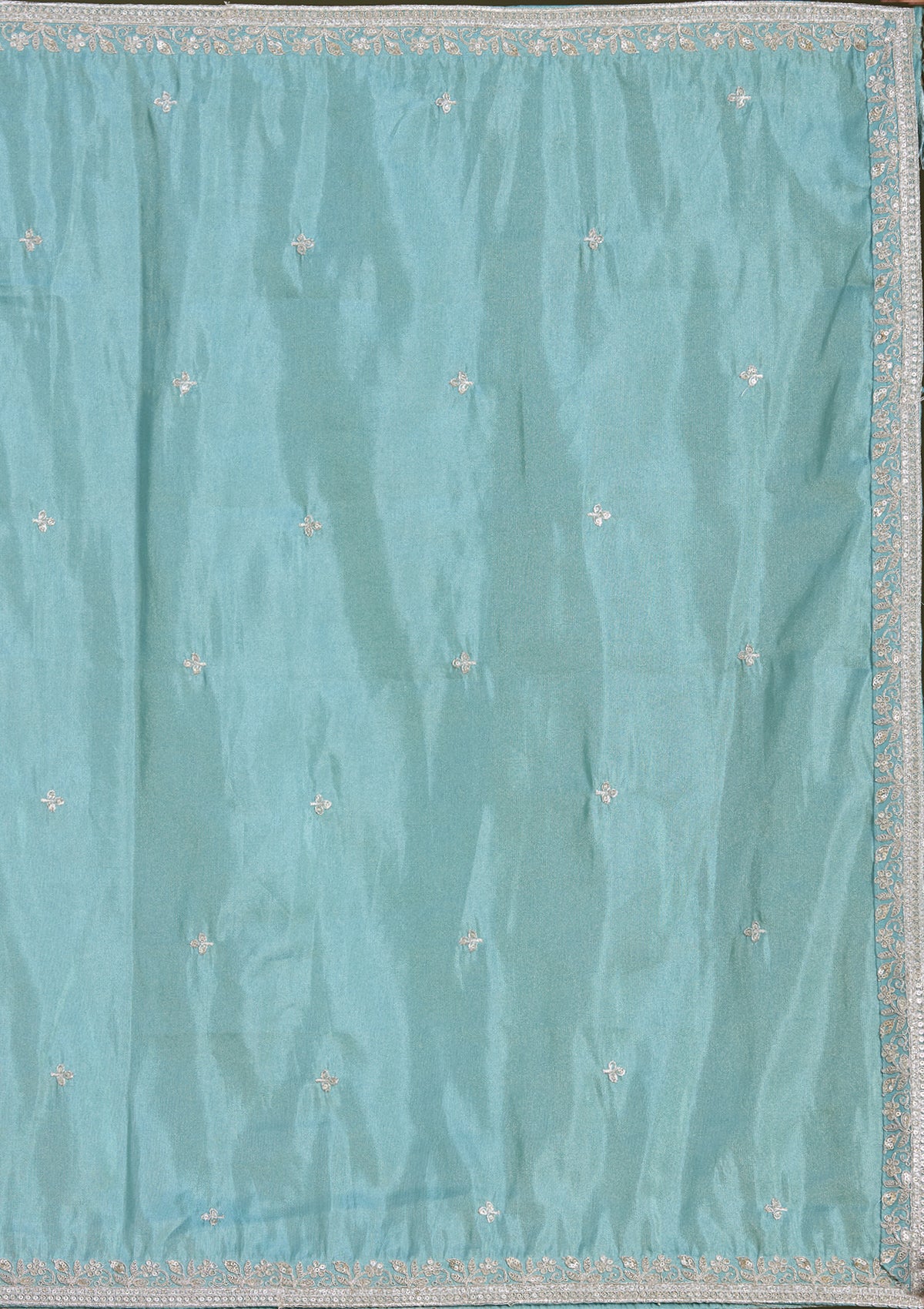 Sky Blue and Lavender Readymade Lehenga in Banarasi fabric. The Lehenga is embellished with sequin embroidery. Accompanied by a Readymade blouse and dupatta. Comes with the Koskii promise of premium quality.