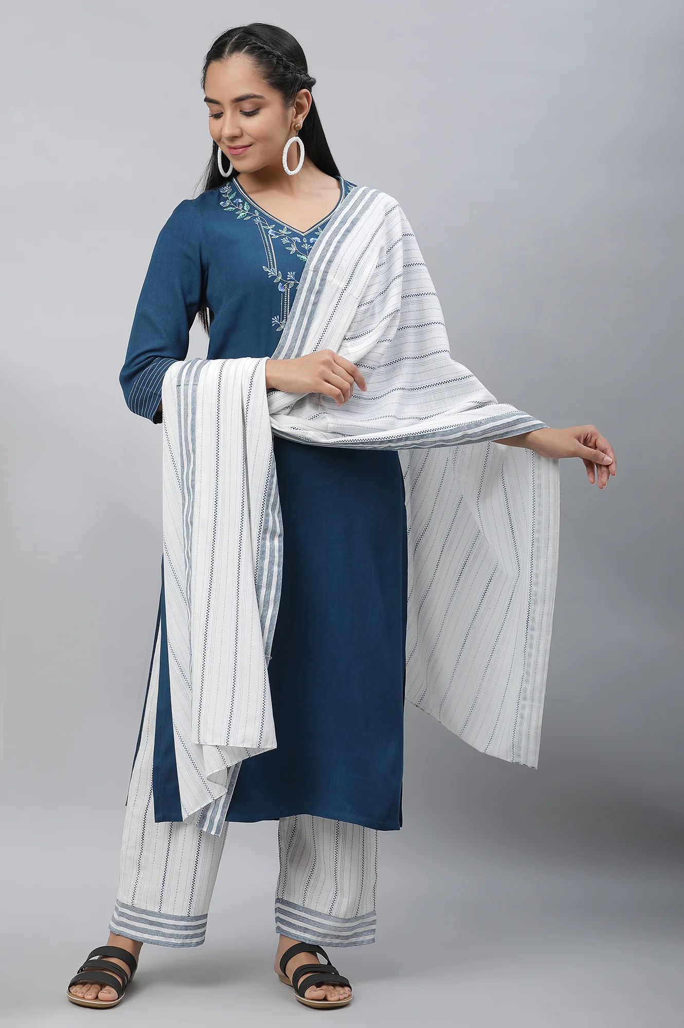 White Cotton Mulmul Stole with Blue Stripes