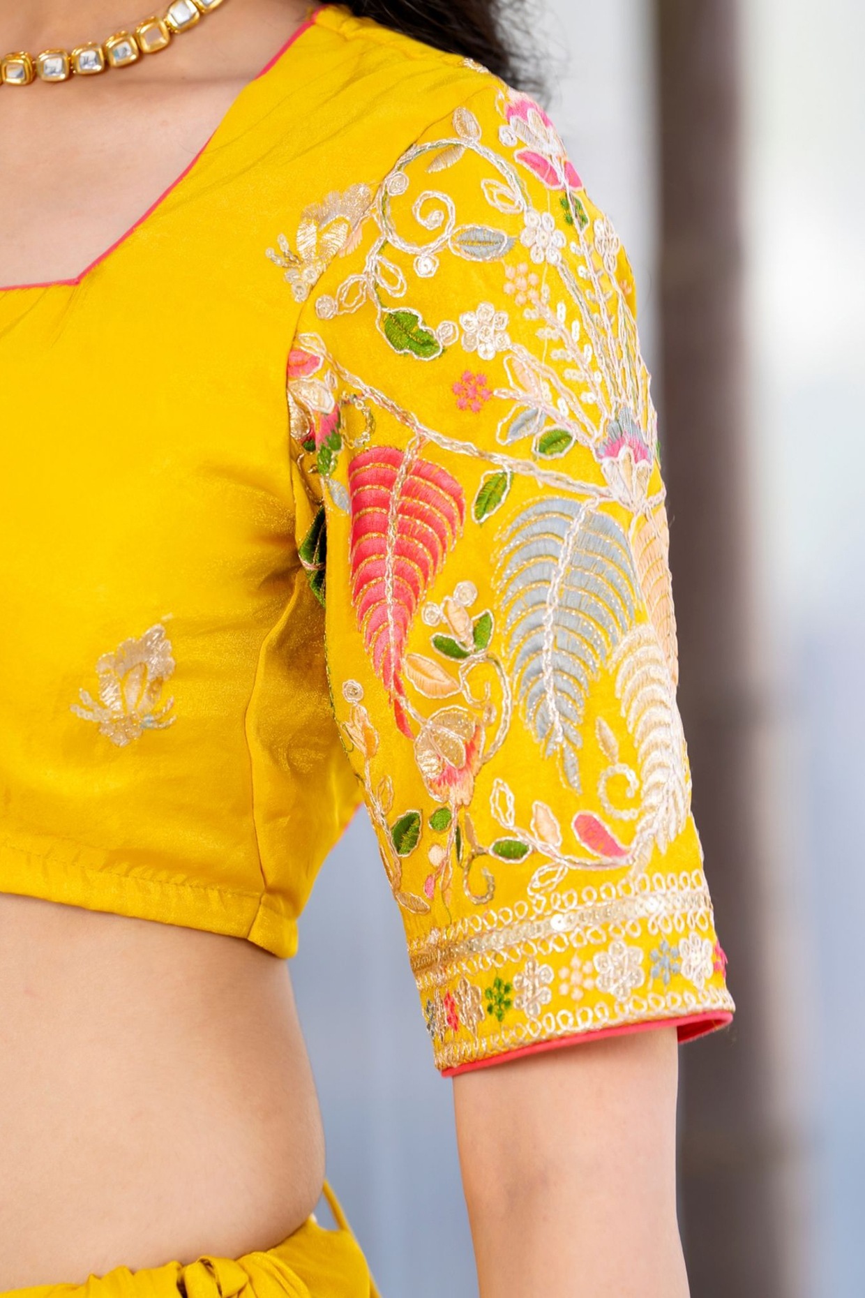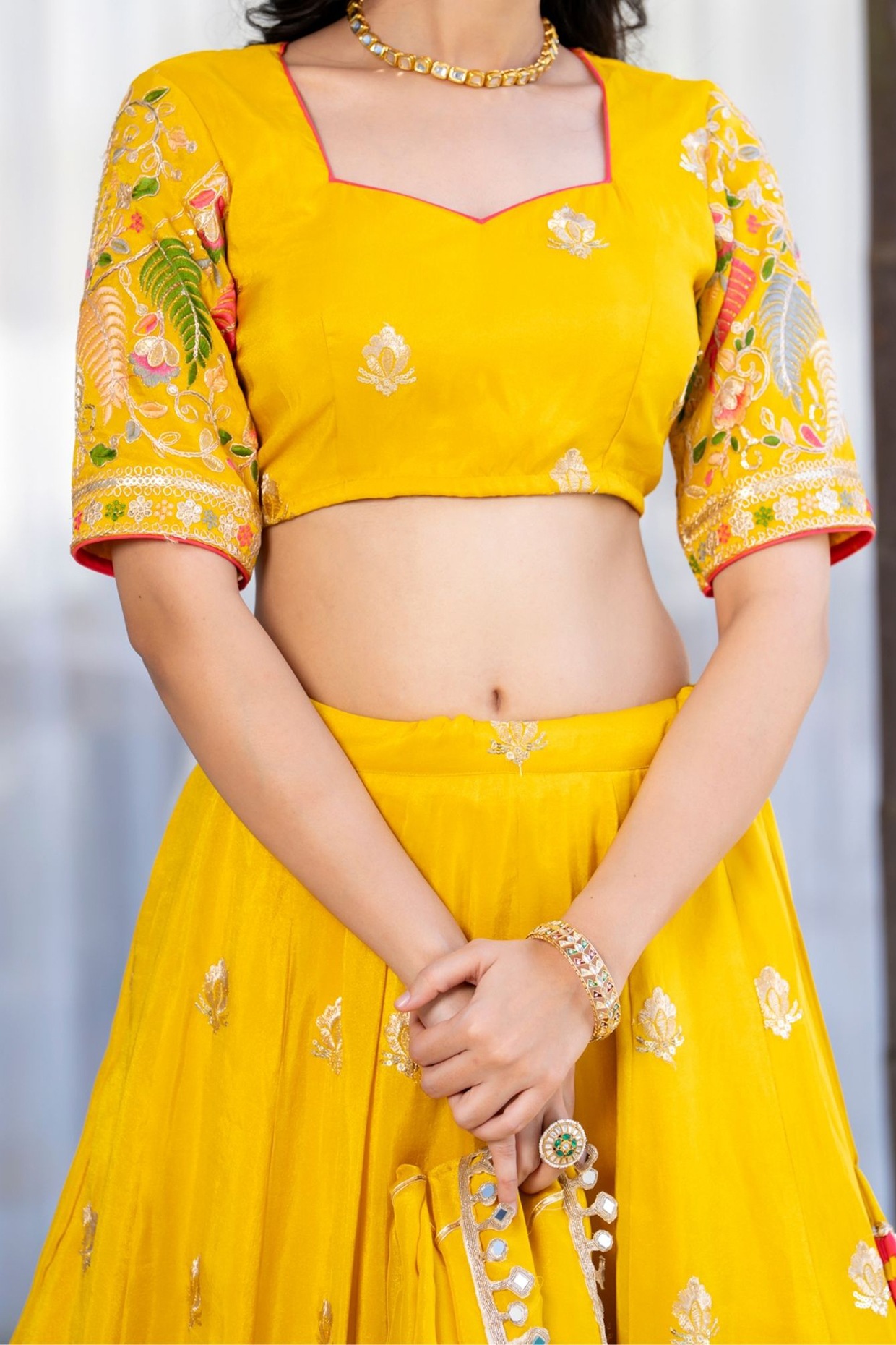 PRODUCT DESCRIPTION Featuring a yellow lehenga in tissue base with zari and floral embroidery, including tassels hanging. It is paired with a blouse and a dupatta. Accentuate it with dangler earrings and heels for festive occasions or wedding ceremonies. Components 3 (Lehenga, Blouse, Dupatta) FIT Fitted at bust and waist. COMPOSITION Tissue. CARE Dry clean…